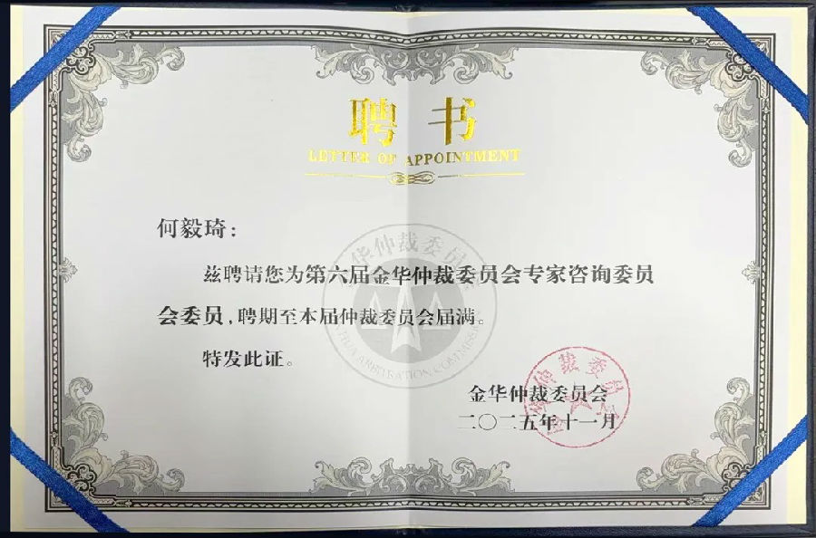 近日,金华仲裁委员会公布第六届金华仲裁委员会组成人员名单。浙江五联律师事务所高级合伙人、义乌分所主任何毅琦律师获聘为本届仲裁委员会专家咨询委员会委员。