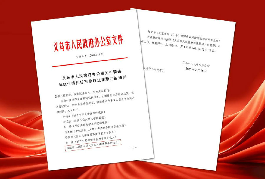 近日,义乌市人民政府办公室正式印发《关于聘请章剑生等担任市政府法律顾问的通知》(义政办发〔2026〕8号),决定聘任包括浙江五联律师事务所高级合伙人何毅琦律师在内的八位法律专家担任义乌市人民政府法律顾问,聘期两年,自2026年1月1日起至2027年12月31日止。
